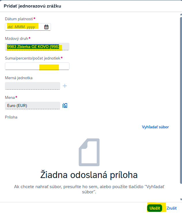- Nahrajte dátum platnosti (ľubovoľný deň v mesiaci január), vyberte mzdový druh 9983 Zbierka OZ KOVO, zadajte sumu, ktorú chcete darovať, menu Euro a uložte údaje: