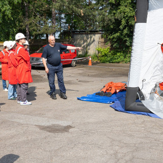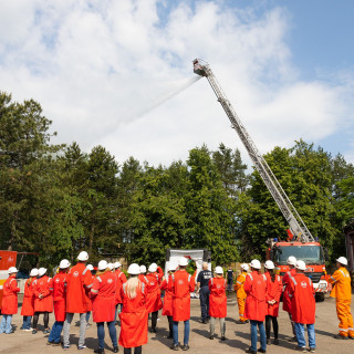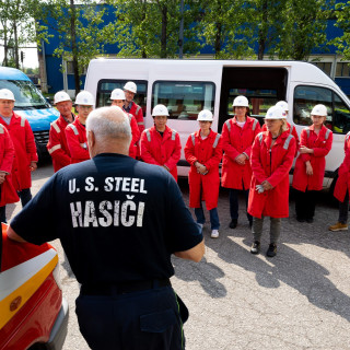 Na prehliadku USSK by nestačil ani celý deň, preto si najskôr všetci pozreli film a aspoň obrazne nakukli aj na tie prevádzky, ktoré neboli v programe exkurzie. Potom už vyzbrojení ochrannými pomôckami z Centra OOPP sa vydali na svoju prvú zastávku: pozrieť si hasičský útvar a jeho techniku. Hasičské vozidlá umožňujú nielen hasenie, ale aj napr. vyslobodenie ľudí z havarovaných áut či horiacich priestorov, a to až do výšky 30 metrov s použitím výsuvného rebríka. Niektorí si neváhali osobne vyskúšať hasičský výstroj. „Fúha, dá to zabrať, v tomto dýchať, utekať a pracovať,“ ocenili fyzickú zdatnosť hasičov. Zmenový veliteľ Jozef Valečko a Peter Vrana i ďalší hasiči nám ukázali všetko, čo používajú pri výjazdoch. Práve keď pustili prúd vody z vysokého rebríka, ktorý okolo nás vytvoril dúhu, sa z reproduktorov hasičov spustil alarm a my sme boli neplánovane svedkami výjazdu k horiacemu autu.