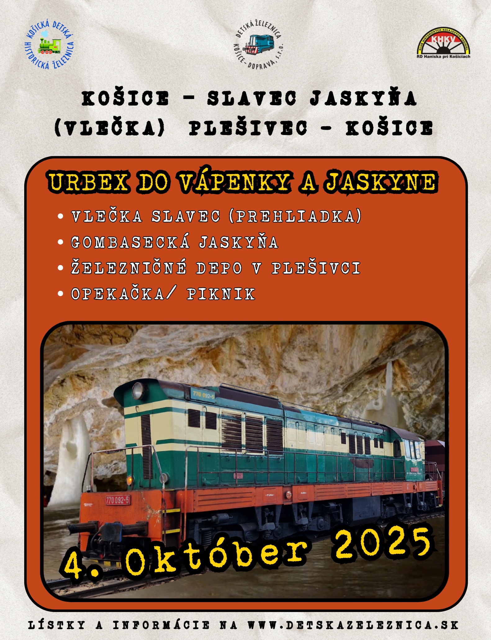 Detská železnica Košice pozýva na ojedinelý železničný zážitok. Výlet spojený s poznávaním a exkurziou nie len do jaskyne, ale aj na železničnú vlečku v Slavci a Plešivci.