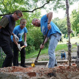 Ďalšou aktivitou bola likvidácia múrika, na ktorej pracovali Martin, Martin a Peter. Chlapi sa museli poriadne zahryznúť do tejto činnosti, kde zužitkovali rôzne druhy zručností. Fotka zachytáva poslednú fázu búrania a upratovanie sute. Dávam do pozornosti Martinov úsmev, ktorý podčiarkuje výsledok tvrdej práce.