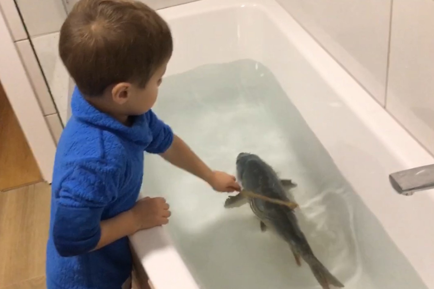 Manžel s vnučkou zo suda najväčšieho kapra vylovia, ktorého do vaničky doma uložia.
