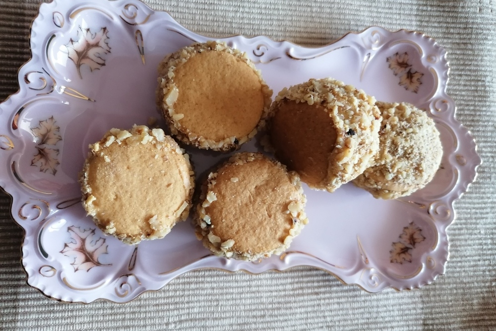 - Kolieska zlepujeme vždy po troch. Prvé natrieme slivkovým lekvárom, priklopíme druhým a natrieme karamelovým krémom, priklopíme tretím kolieskom. Keď máme takto natreté všetky kolieska zboku ich pomažeme zvyšným krémom a natreté boky obalíme v zmesi nasekaných orechov a koliesok.
