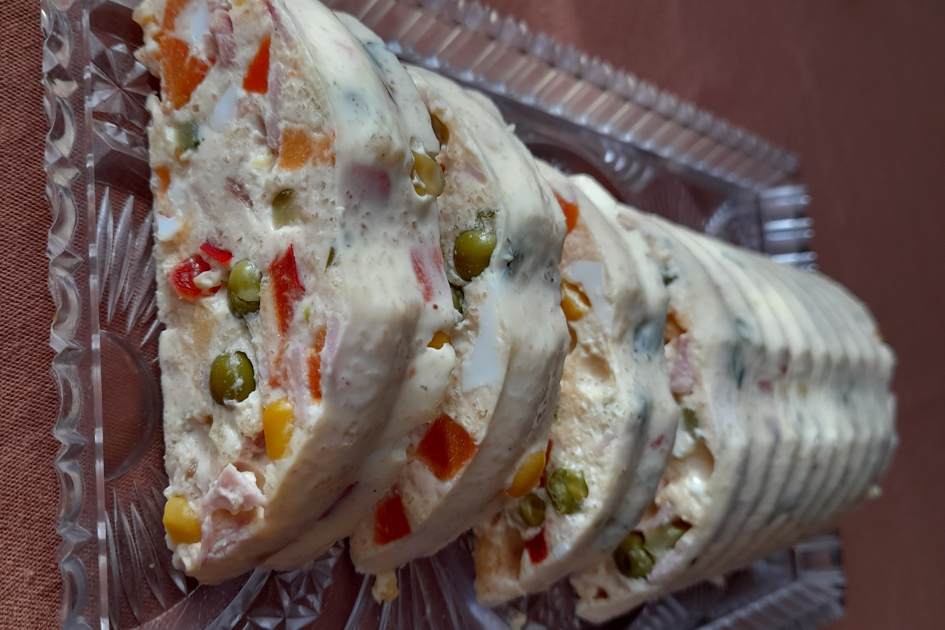 Vajcia uvarené na tvrdo, šunkovú salámu, sterilizovanú zeleninu pokrájame na malé kocky pridáme majonézu a zamiešame.