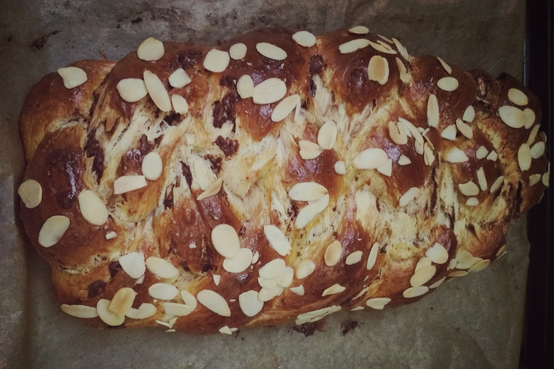 Potrebujeme: 500 g hladkej múky, 150 g rastlinného tuku do cesta, ideálne izbovej teploty, 100 g kryštálového cukru, 250 ml mlieka, 2 lyžičky soli, 3 žĺtka, 1 kocka droždia, 1 balíček vanilkového cukru, 2 lyžičky sušenej citrónovej kôry, 80 g hrozienok namočených aspoň 3 hodiny v rume - môžeme nahradiť posekanou horkou čokoládou, 1 vajce na potretie, hrsť mandľových lupienkov