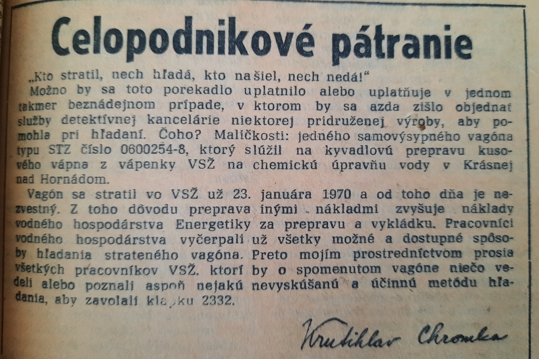Vedenie nášho podniku a PV ROH v snahe zlepšiť aktivitu pracujúcich na úseku zlepšovateľského hnutia vyhlasuje týmto celopodnikovú akciu. Za každú podanú prihlášku zlepšovacieho návrhu podanú v čase od 2. do 30. júna1975 tak jednotlivcom vyplatí 50 Kčs a kolektívom 100 Kčs odmeny.