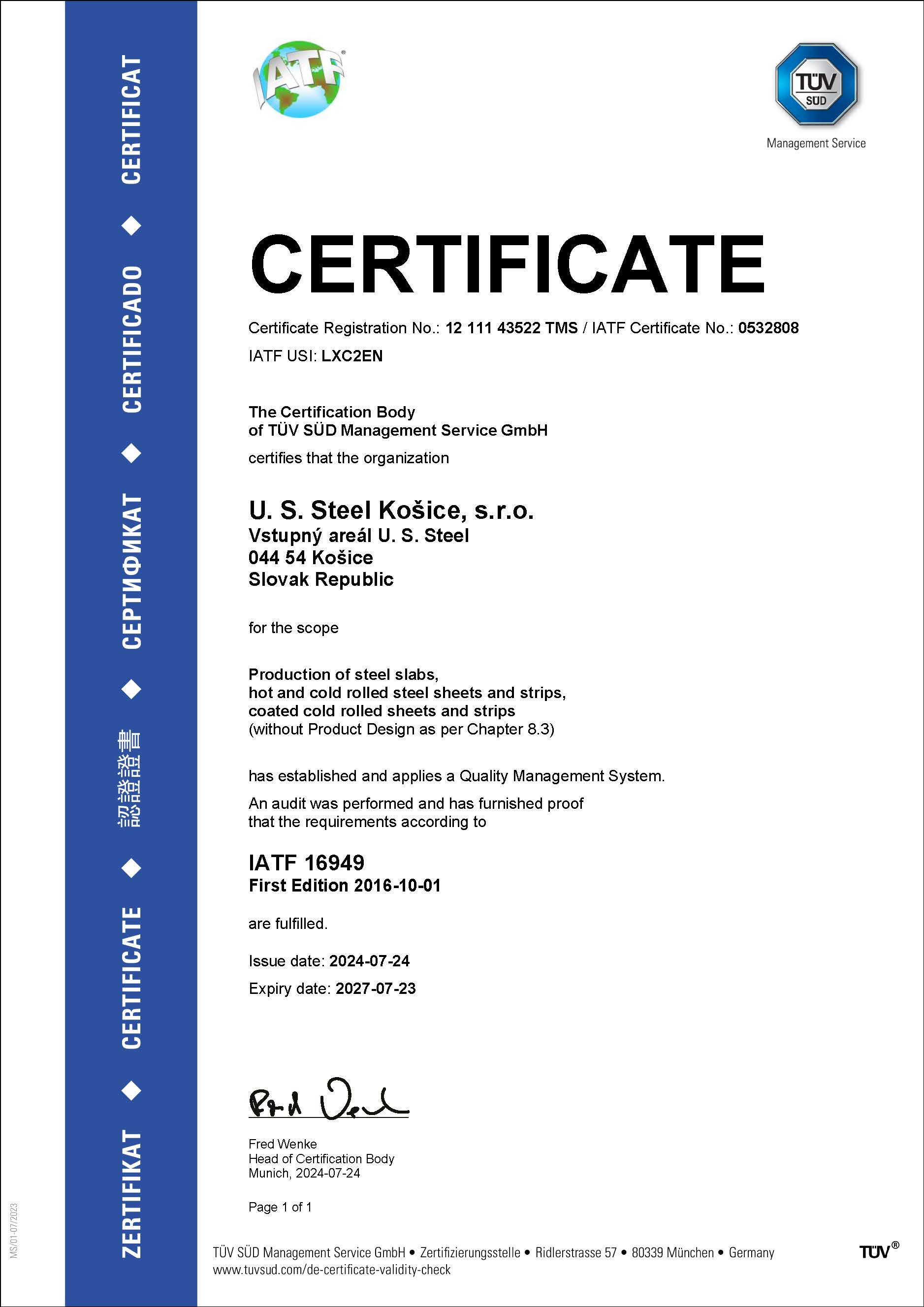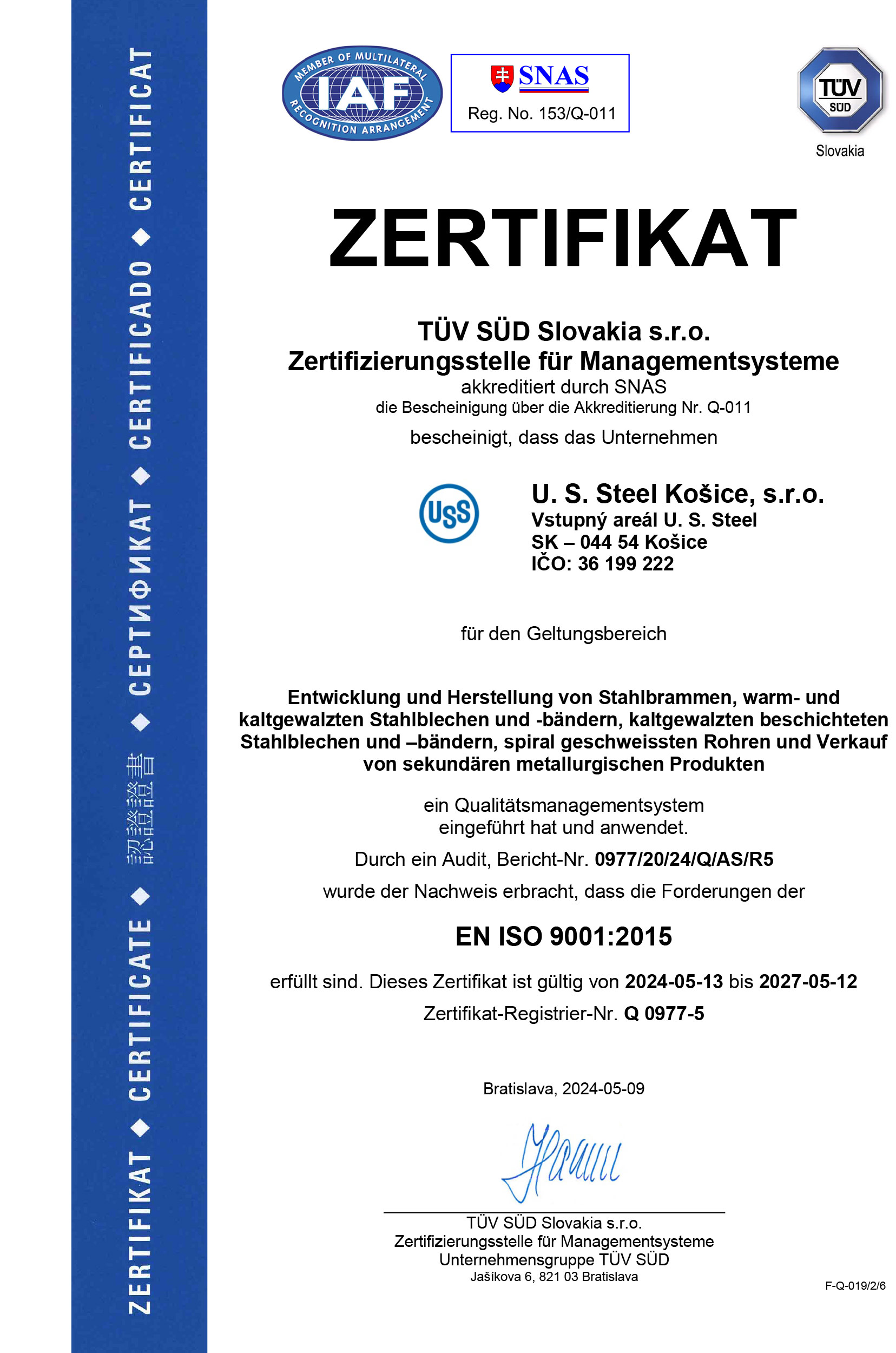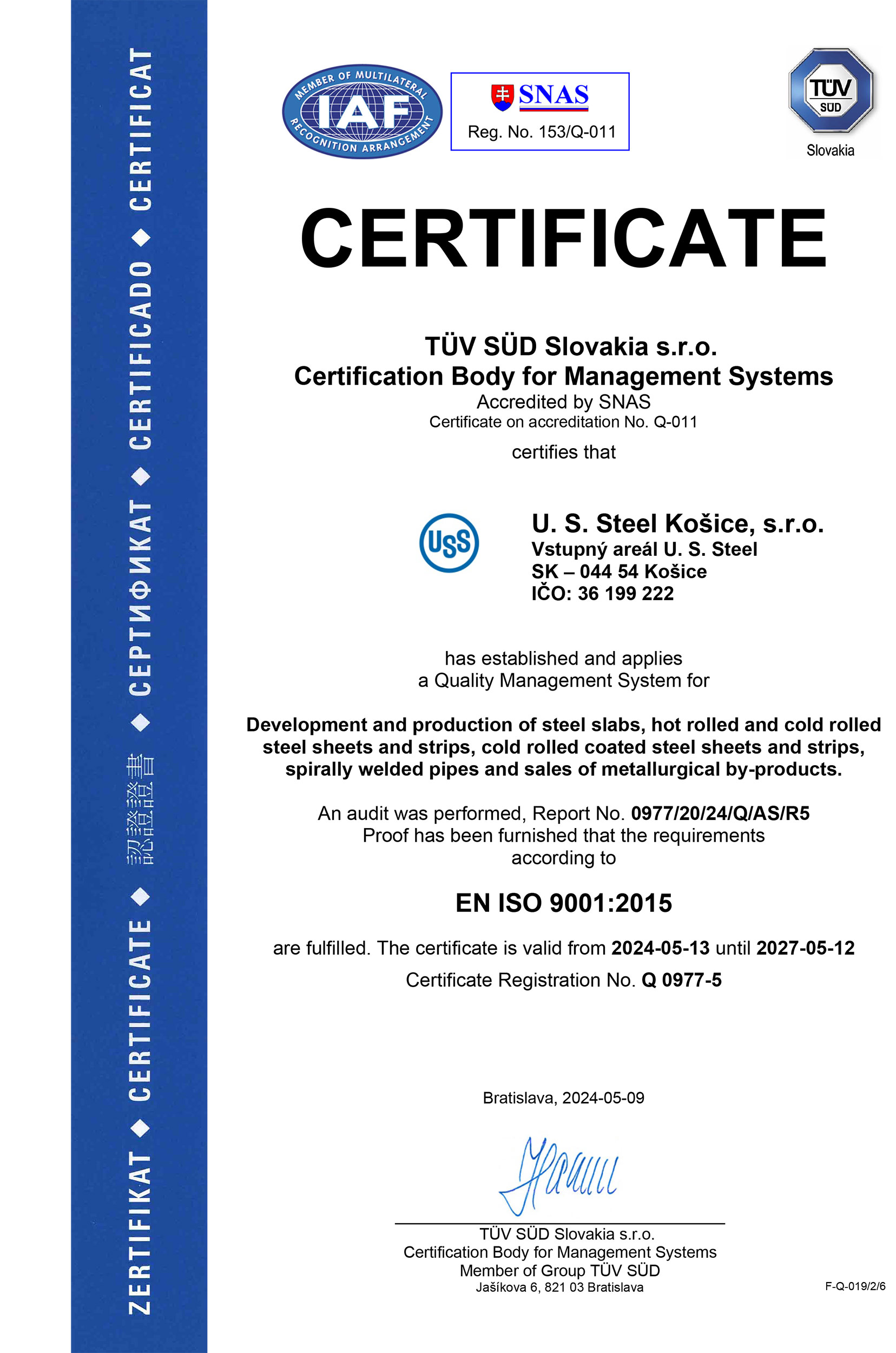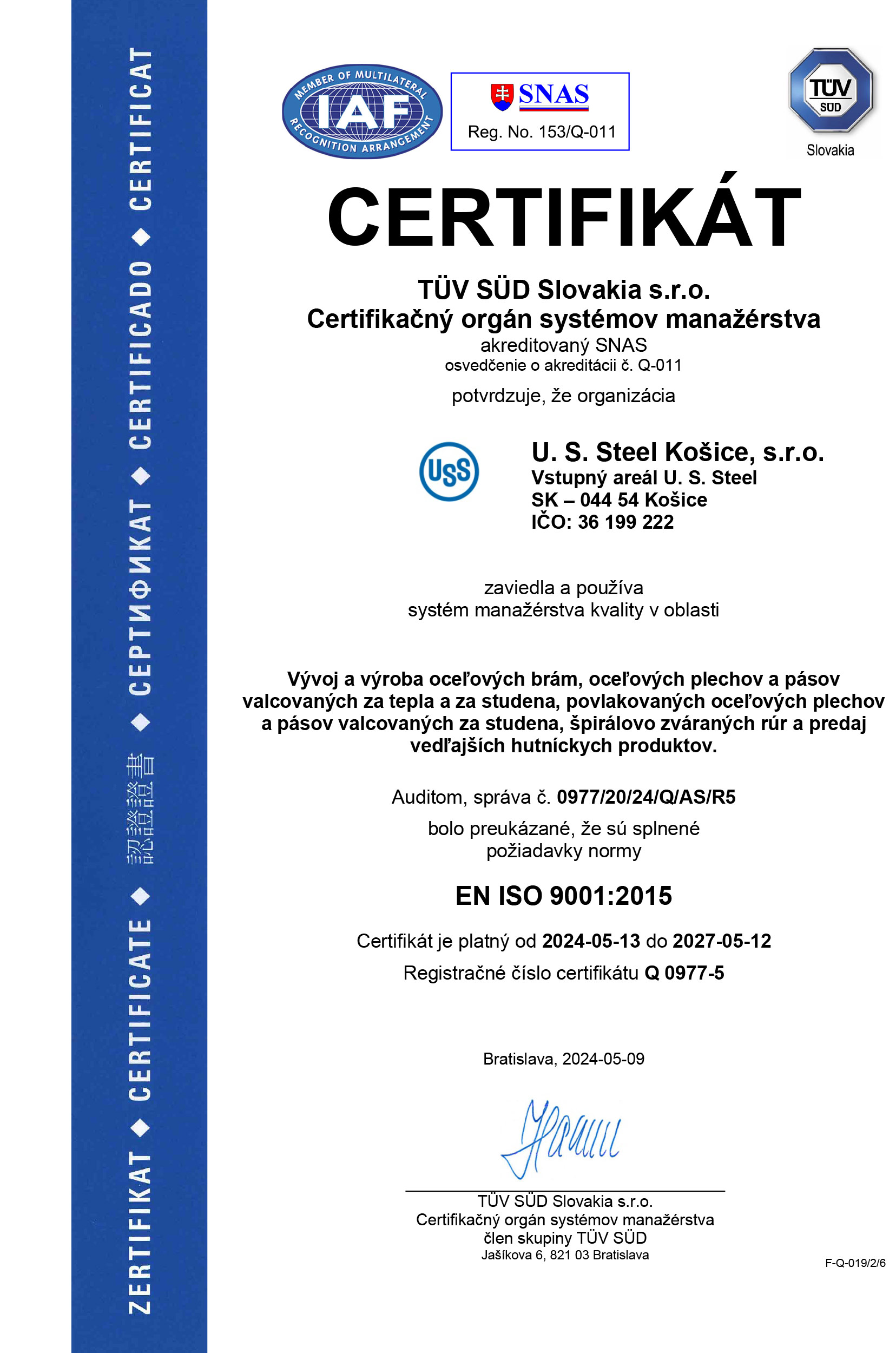 Dňa 3. júla 2024 spoločnosť U. S. Steel Košice získal certifikát AEO (Authorized Economic Operator). Pre získanie tohto ocenenia, musela spoločnosť prejsť procesom hodnotenia a auditu vykonávaným colnými orgánmi. Cieľom programu AEO je zabezpečiť, aby medzinárodný obchodný reťazec bol bezpečnejší a efektívnejší, čo vedie k lepšiemu riadeniu rizík a zníženiu nákladov.