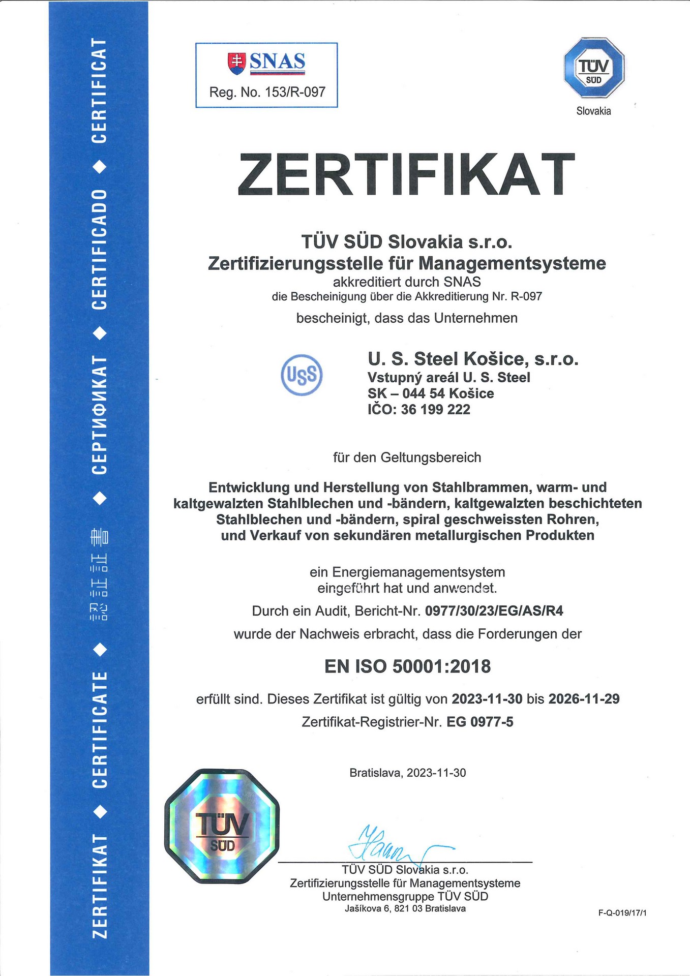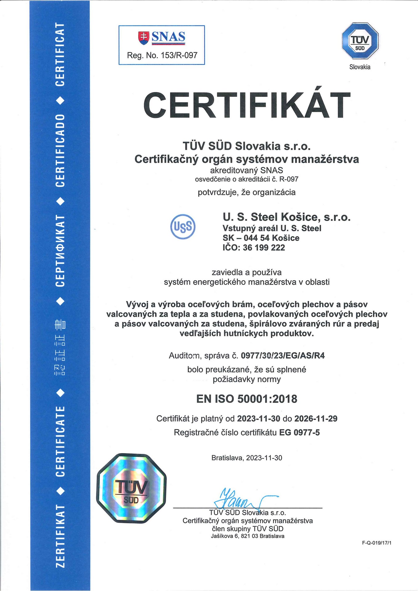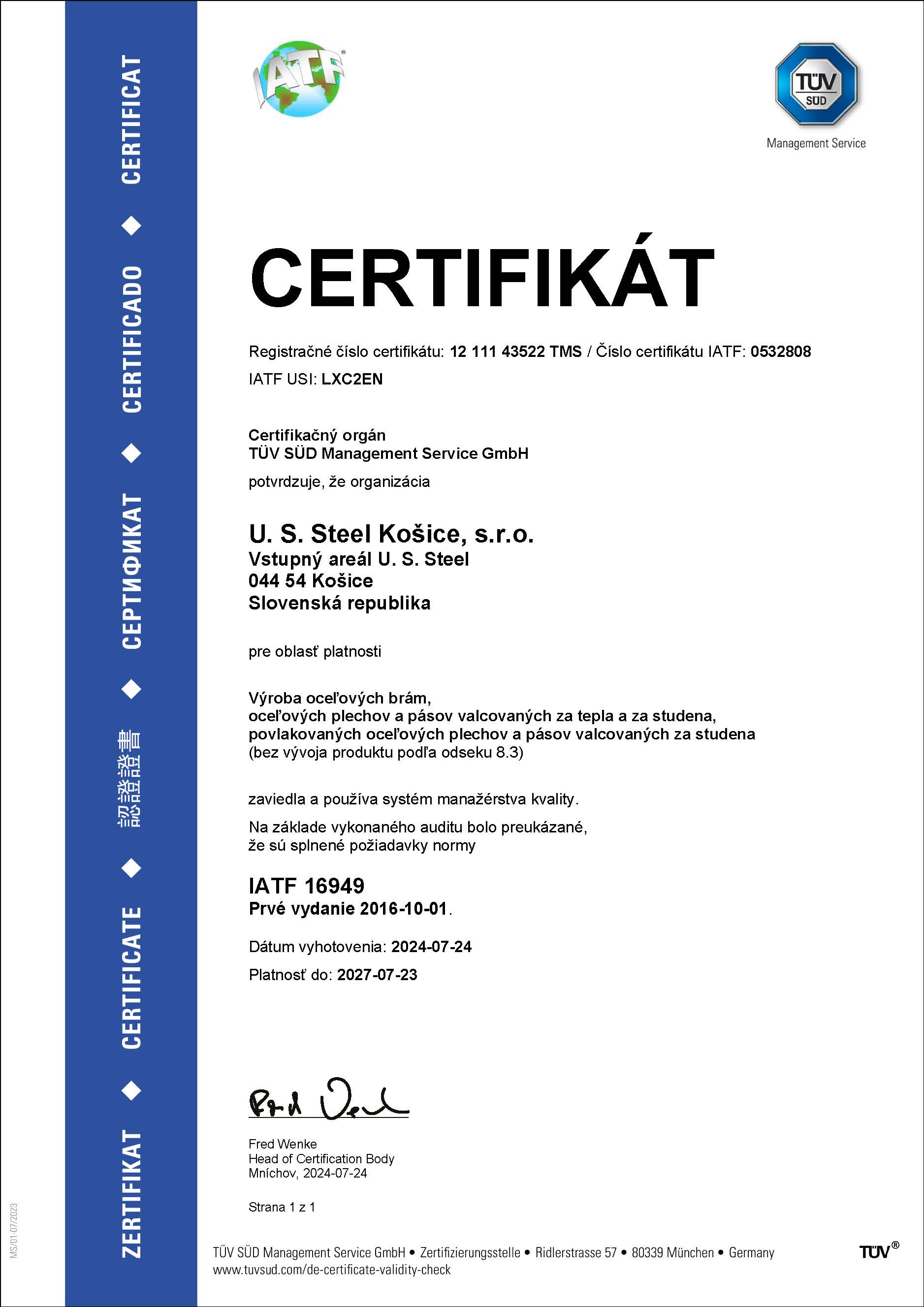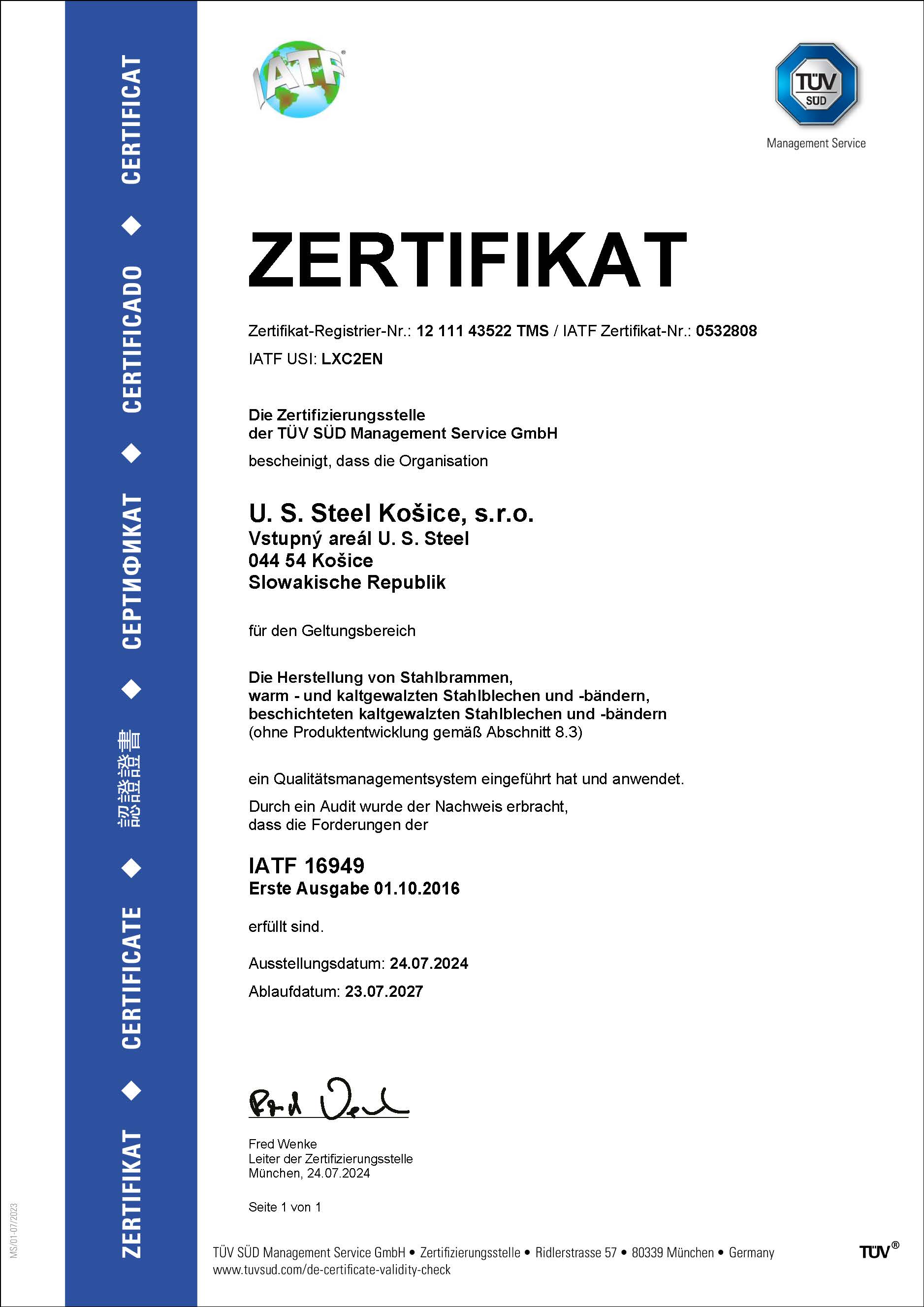 Dňa 3. júla 2024 spoločnosť U. S. Steel Košice získal certifikát AEO (Authorized Economic Operator). Pre získanie tohto ocenenia, musela spoločnosť prejsť procesom hodnotenia a auditu vykonávaným colnými orgánmi. Cieľom programu AEO je zabezpečiť, aby medzinárodný obchodný reťazec bol bezpečnejší a efektívnejší, čo vedie k lepšiemu riadeniu rizík a zníženiu nákladov.